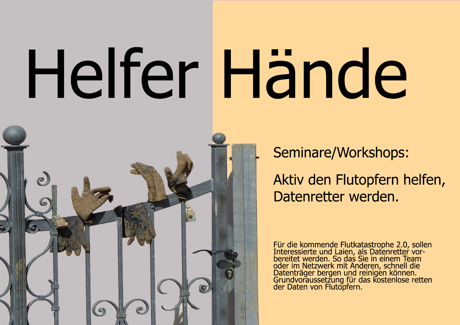 Workshop „Helfer Hände“ entstand durch die hohe Nachfrage an Hilfsbereitschaft. Viele wollen gerne helfen, wissen aber nicht wie. Persönlich bin ich der Meinung das jeder mit einer Zahnbürste oder einem Pinsel umgehen kann, warum also keine Interessierten oder Laien zu Datenrettern ausbilden. Die nächste Flutkatastrophe 2.0 kommt leider bestimmt und bis dahin benötigen wir Helfer, die sich mit in diesem Thema auskennen, denn Zeit ist ein sehr wertvoller Verbündeter bei der Datenrettung.